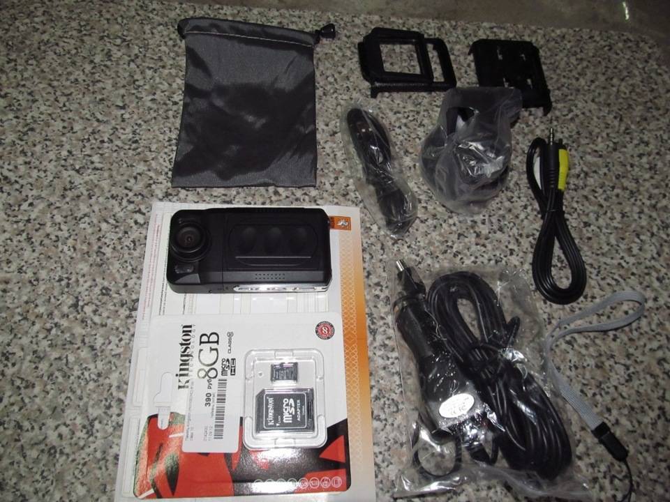 2. Зарядил его 8Gb флешкой 10 класса. Весь комплект разложил (регистратор, мешочек под него, питание от прикуривателя, видео-кабель, USB-кабель для ПК, крепеж на стекло, инструкция)