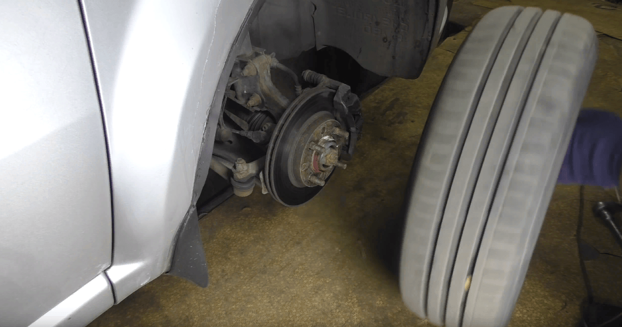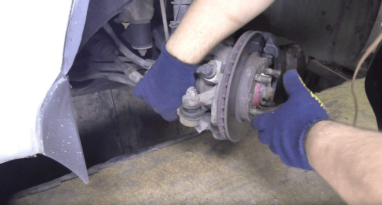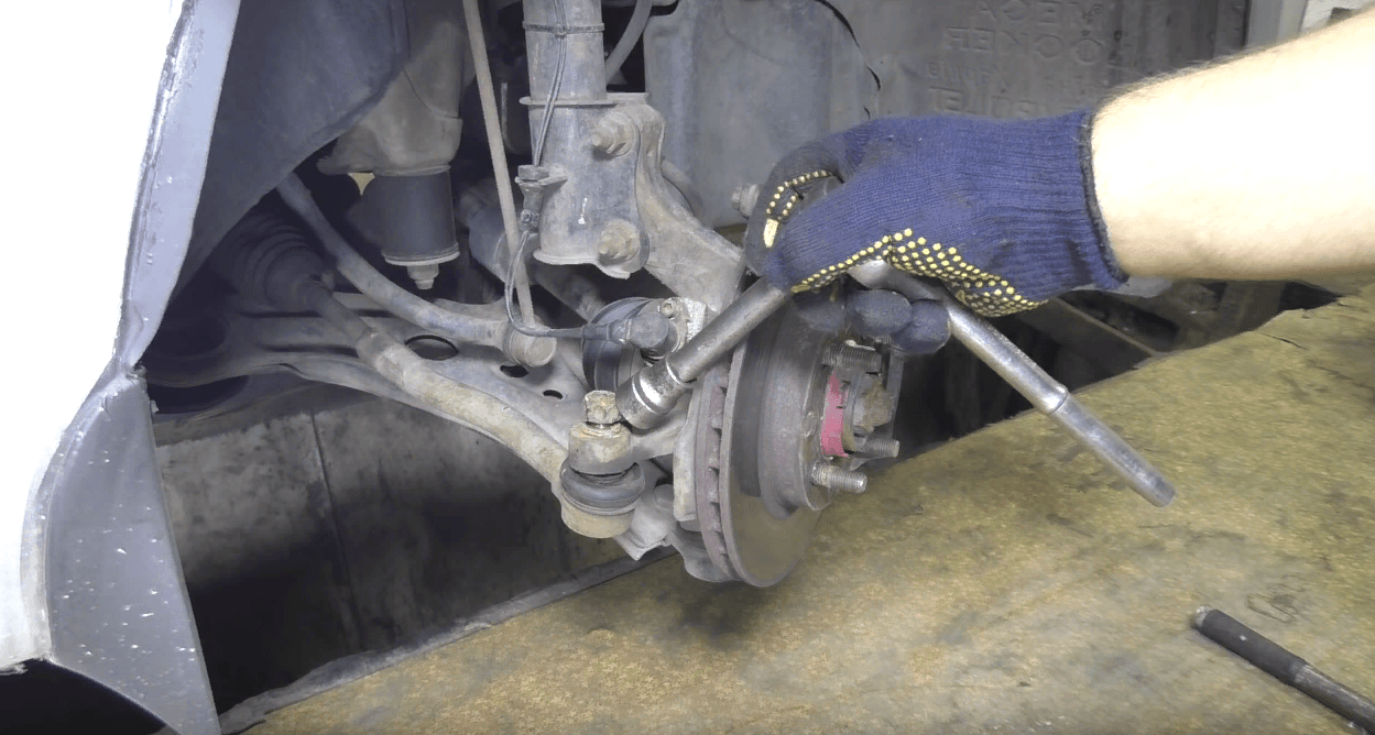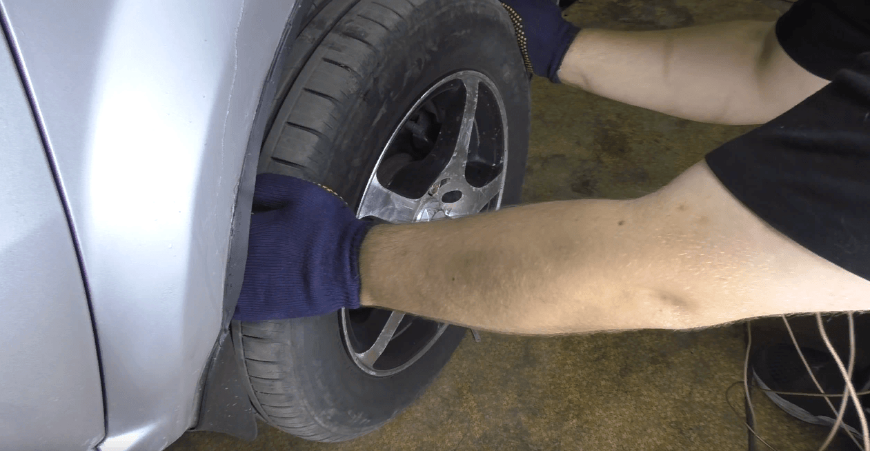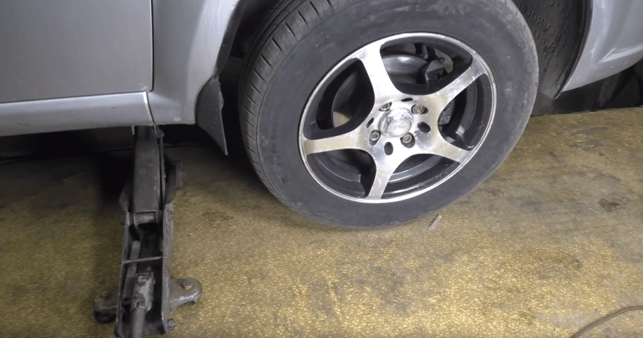 В первую очередь повторяем манипуляции указанные выше (как при диагностике наконечников), а именно — домкратим автомобиль с необходимой стороны и вывешиваем колесо. Затем балонным ключом откручиваем колесо и снимаем его, доступ к наконечнику, рулевой тяге и кулаку свободен.