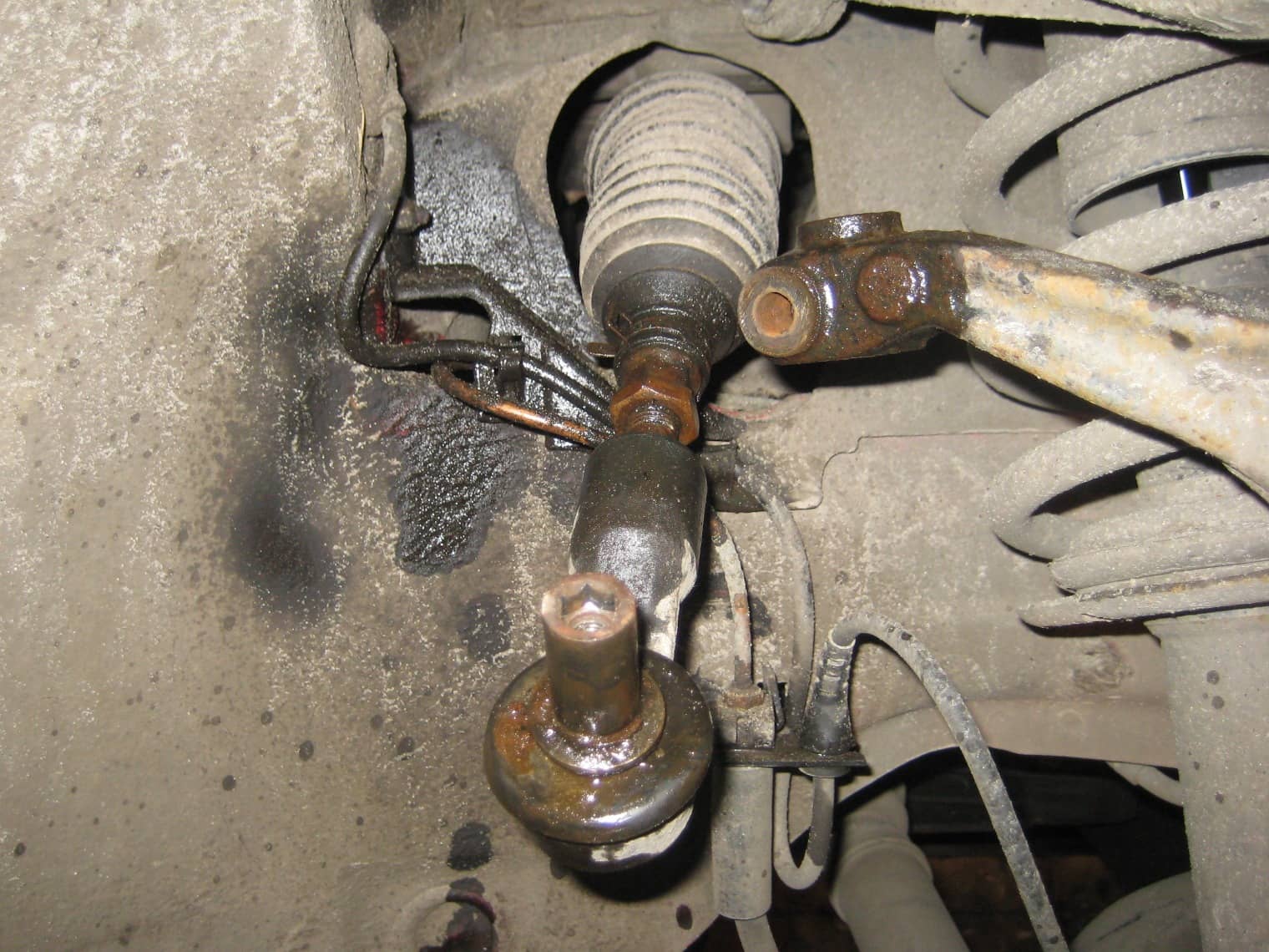 Теперь используем корщетку и тщательно очищаем места крепежных гаек на тяге и наконечнике, после чего наносим на них смазку WD-40 или любой другой жидкий ключ. Выжидаем несколько минут и начинаем откручивать гайку со стороны рулевого тяги.