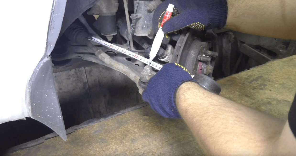 В данном случае я меряю от хомута пыльника до центра болта, можно до края болта, как удобно, я отмеряю по краешку болта с этой стороны.
