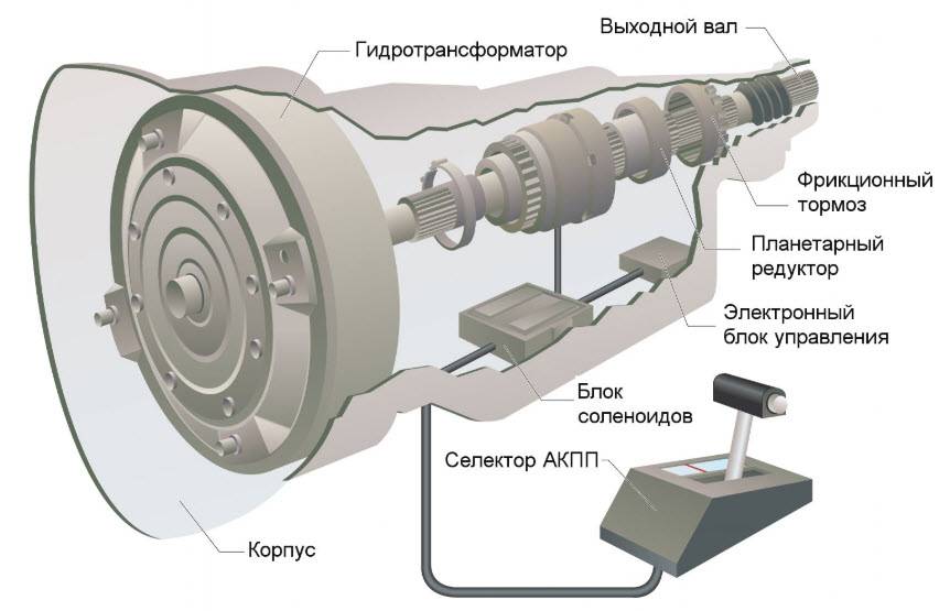 Автоматическая коробка в двух словах характеризуется как комфорт, удобство. Здесь сцепление осуществляется гидротрансформатором, переключается же передачи электроника, точнее – электронный блок совместно с исполнительными механизмами, в их числе:
