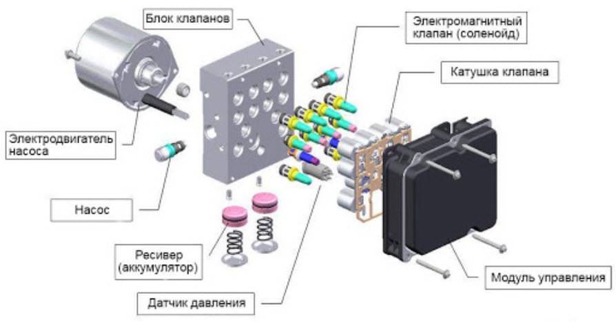 Устройство антиблокировочной системы состоит из трех основных составных элементов:
