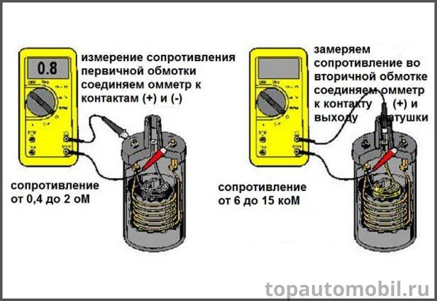 Во время этой проверки щупы мультиметра должны быть подключены к плюсовому контакту и к проводам высокого напряжения. Если в устройстве есть специальный пластинчатый сердечник, то параметры сопротивления будут в пределах от 6 до 9 кОм. Все другие категории катушек превышают 15 кОм.
