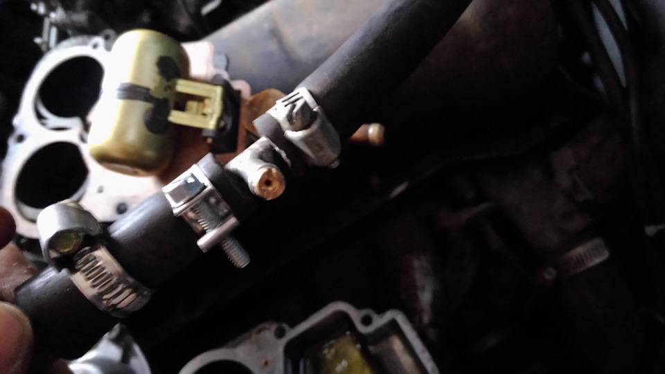 Перед карбюратором на расстоянии 5-7 см был врезан тройник 8х6х8. В трубке тройника диаметром 6 мм была нарезана резьба и вкручен 150 топливный жиклер.