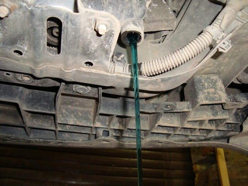 - Дайте двигателю остыть до 40—50 °С, чтобы при работе не обжечь руки. Частично или полностью слейте антифриз из системы охлаждения.