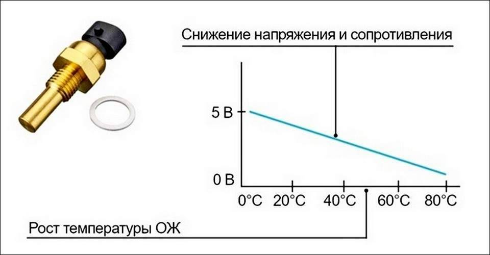 Когда двигатель не работает, температура антифриза практически не отличается от температуры окружающей среды. При этом сопротивление термистора имеет максимальное значение. Через датчик не подается ток в электрическую цепь блока управления. При запуске мотора происходит замыкание в замке зажигания. На датчик поступает напряжение.