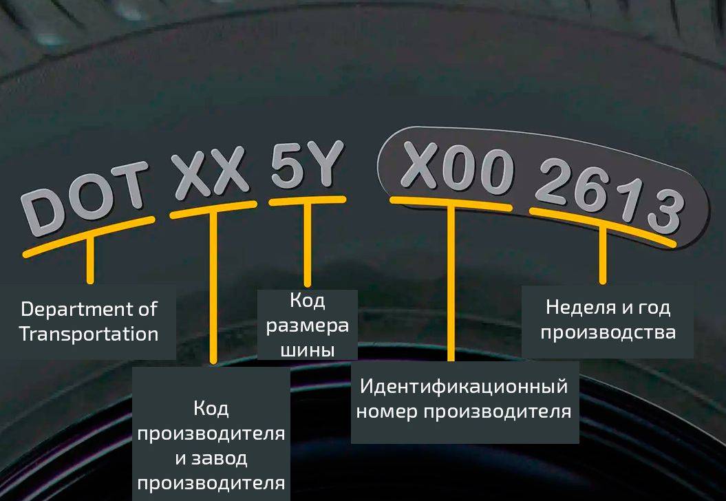 DOT — шина соответствует американским стандартам качества (Department of Transportation— Министерство транспорта США), следом за обозначением DOT идет цифровой код, в котором зашифрованы завод-изготовитель, пресс-форма и партия производства