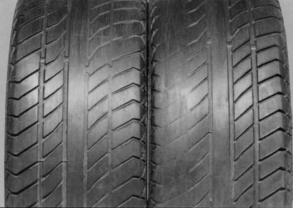 Пройдемся по каждому виду. Итак, износ по краям с обеих сторон резины (визуально видно, что по бокам протектор стерт значительно сильнее, чем в центральной части) указывает на то, что давление в колесах ниже нормы. Происходит это из-за того, что в центральной части шина прогибается, и основная нагрузка приходится на боковые зоны. Стоит отметить, что к такому результату приводит эксплуатация шин с недостаточным давлением значительный период.