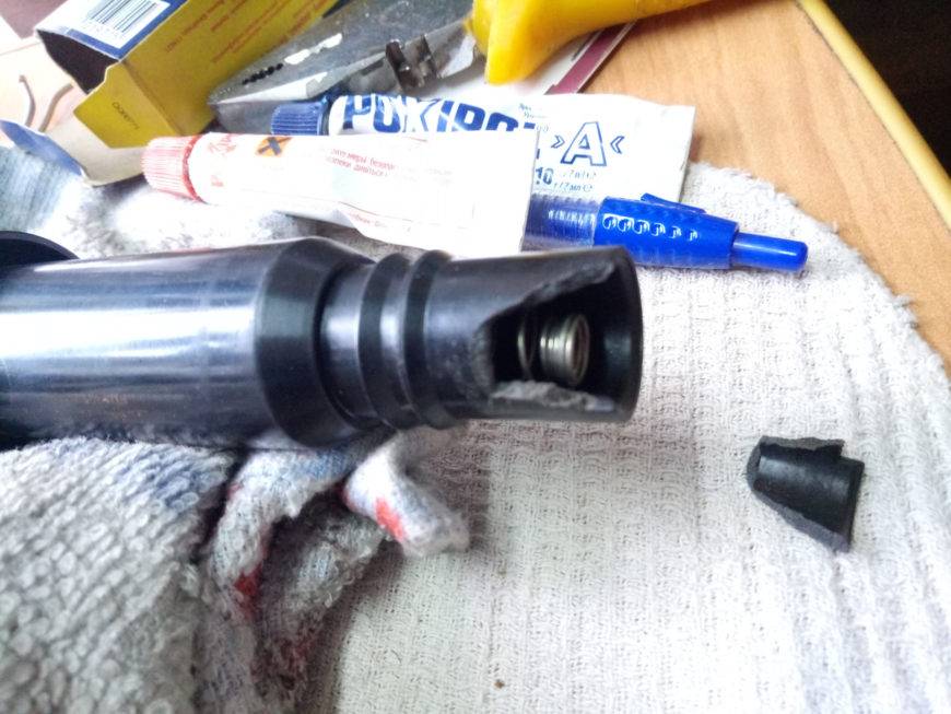 - на возможные трещины и повреждения корпуса и резинового колпачка,