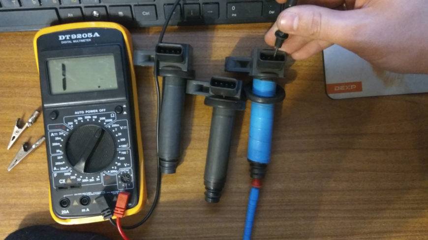 Проверка катушки зажигания мультиметром в режиме Омметра во вторичной обмотке.