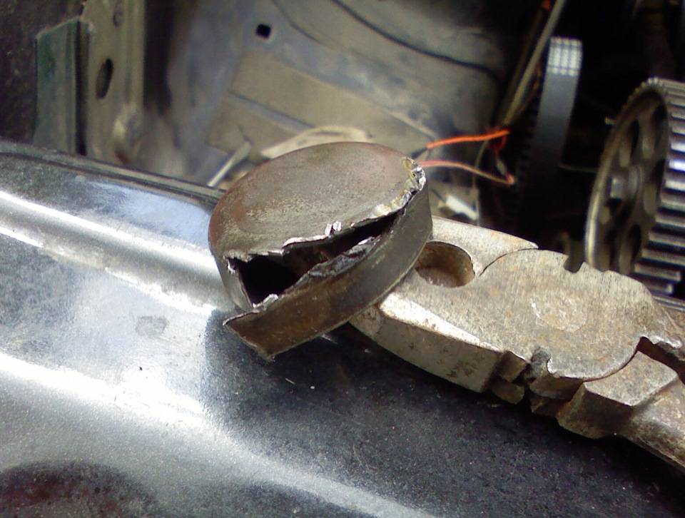 Чтобы извлечь поврежденную заглушку необходимо отверткой или тонким зубилом пробить или провернуть поврежденную деталь примерно на 90 градусов. Пробитую пробку нужно достать с посадочного места. В случае поворота заглушки необходимо достать эту деталь используя пассатижи. Если пробка приржавела, и мы не можем ее вытащить, нам поможет дрель и вороток. В заглушке высверливается отверстие и воротком удаляется старая деталь.