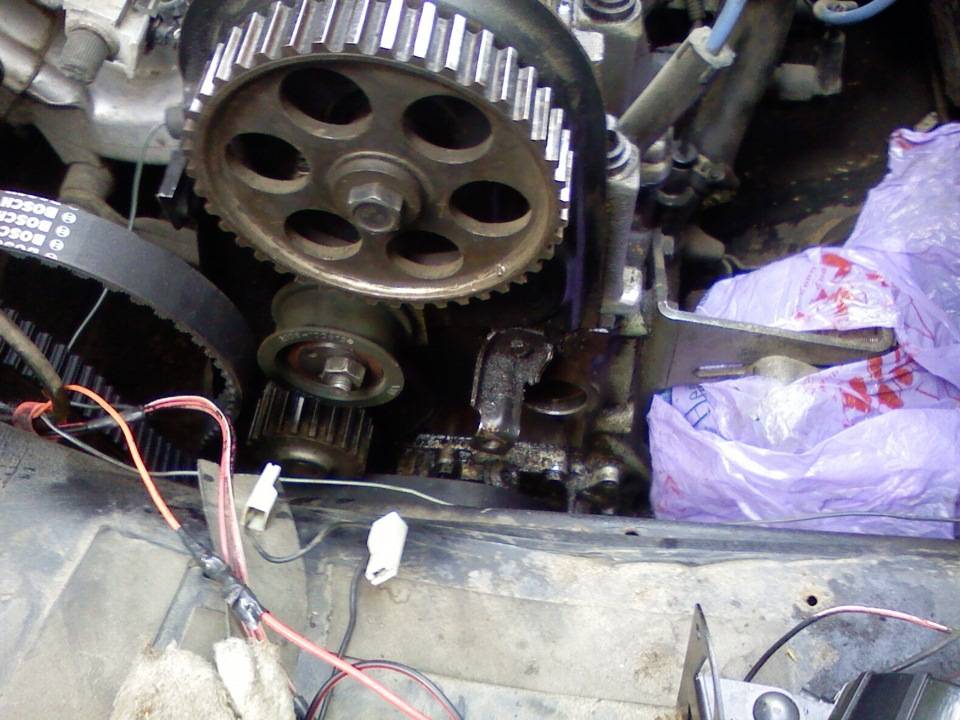 - Снимаются защитная крышка зубчатого ремня. Откручивается гайка, которая крепит натяжной ролик, снимаются ролик вместе с дистанционным кольцом и осью, а затем со шкива распредвала снимается ремень.