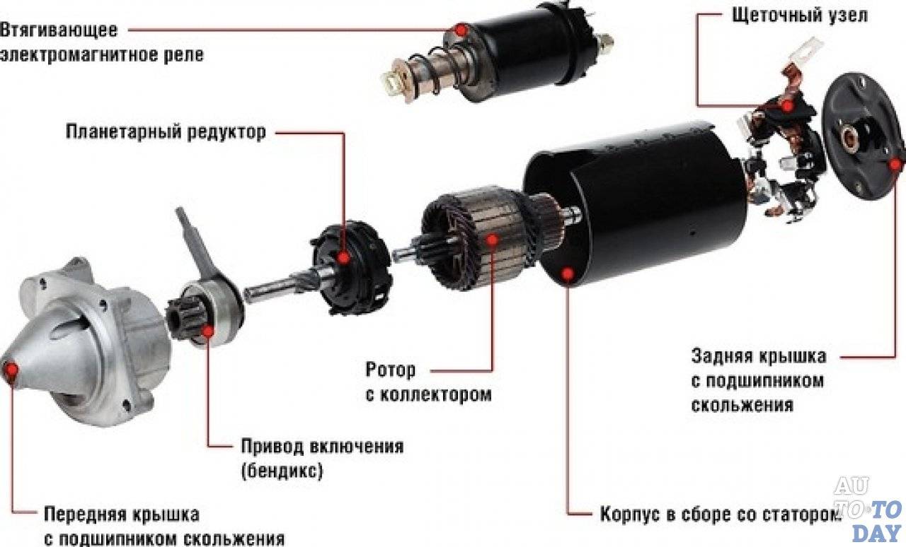 Стартер автомобиля фактически представляет собой электродвигатель, который «присоединяется» своей шестерней (шестерня бендикса стартера) к маховику (венец маховика), прокручивает коленчатый вал и после отсоединяется после запуска мотора.
