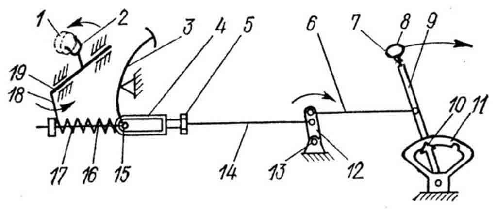 1 – выжимной подшипник; 2 – вилка; 3 – педаль; 4 – муфта; 5 – контргайка; 6 – малая тяга; 7 – стержень; 8 – кнопка; 9, 12, 18 – рычаги; 10 – защёлка; 11 – зубчатый сектор; 13 – промежуточная опора; 14 – большая тяга; 15 – ось; 16 – промежуточная тяга; 17 – пружина; 19 – валик