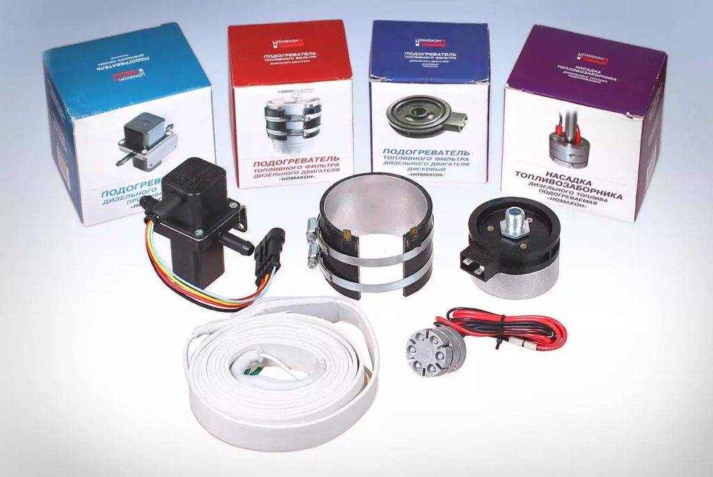Кроме приборов, нагревающих двигатели, производятся также модели, подогревающие топливные системы дизельных двигателей. На сильном морозе солярка может загуститься так, что дизель не удастся запустить. Такие подогреватели нагревают дизтопливо до приемлемой температуры. Питаются от аккумуляторов, напряжением постоянного тока 12 в. Такие приборы, марки «Номакон», производятся в Беларуси. Выпускаются в нескольких модификациях, устанавливаемых в разных узлах топливной системы.
