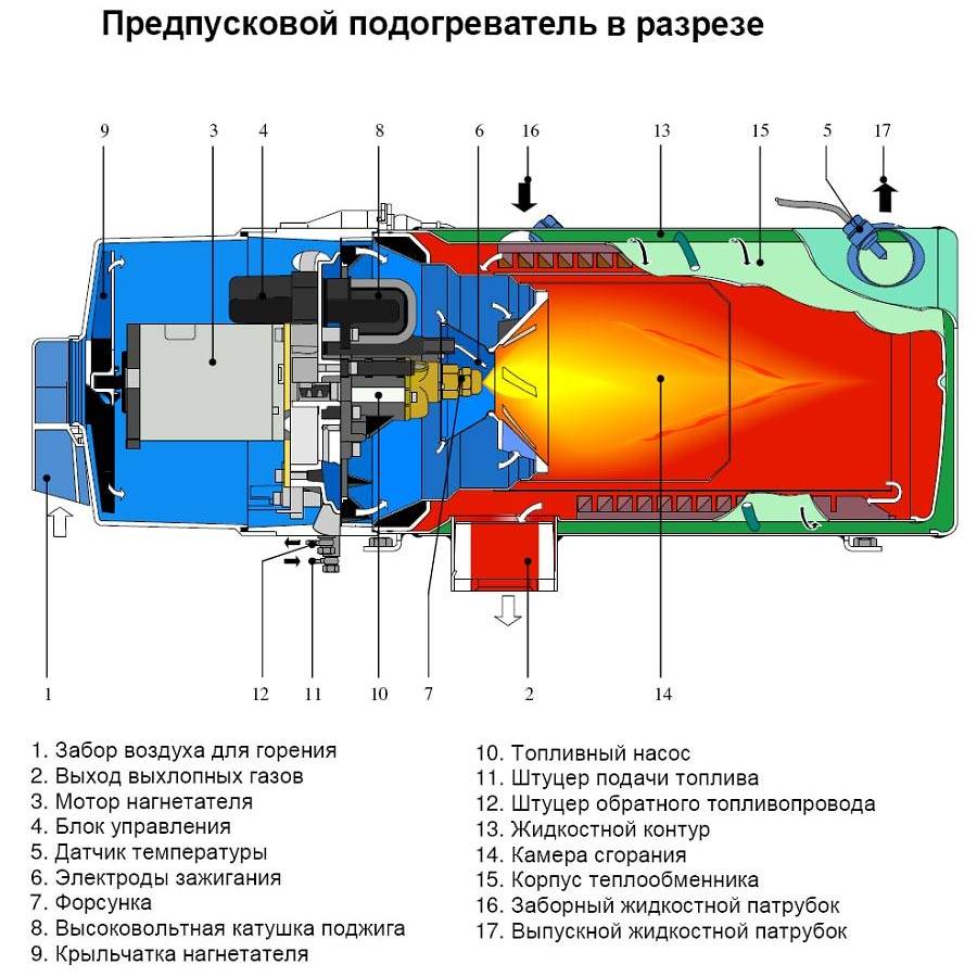 Основное назначение таких устройств — разогрев мощных дизелей и дизтоплива при температурах ниже -15 °C. Выпускаются две разновидности автономных нагревателей — жидкостные и воздушные. Жидкостные могут потратить от 0.5 до 1 литра топлива за час работы. Нагрев происходит быстро, за 15–20 минут. Всей работой управляет электронный управляющий блок (ЭБУ) в автономном режиме. Воздушные устройства более экономичны и тратят до 250 грамм горючего за час работы. Но их основное назначение — нагрев салона, а не силового агрегата.