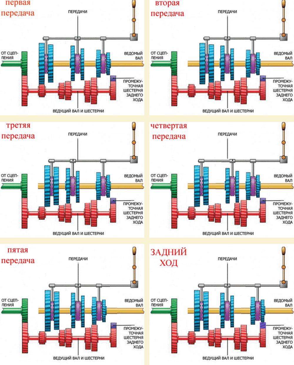 В стандартных МКПП оси валов расположены параллельно, на них располагаются шестеренки. Ведущий (первичный) вал присоединяется к маховику мотора через корзину сцепления, находящиеся на нем продольные выступы передвигают второй диск сцепления и передают через жестко закрепленную ведущую шестерню вращающий момент на промежуточный вал.