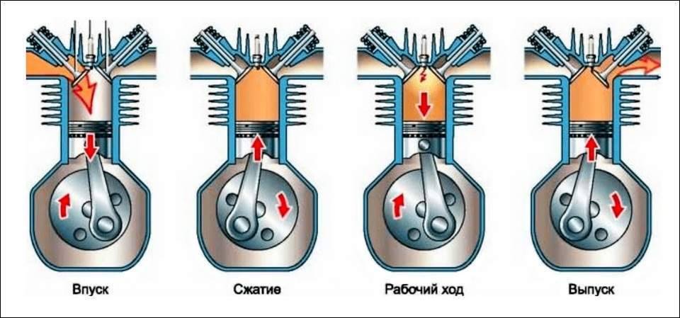 Принцип работы силового агрегата основывается на преобразования тепловой энергии в механическую. Повторяющиеся процессы в моторе являют собой рабочий цикл двигателя. Зависимо от того, сколько поршень делает ходов, двигатели делятся на четырехтактные и двухтактные. Двигатели внутреннего сгорания, которые применяются в машинах, работают по 4-тактному циклу. Сюда входит впуск топлива, рабочий ход (туда-назад) и выпуск отработанных газов.