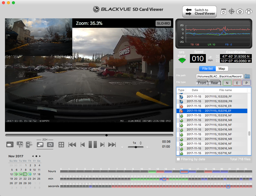 You can easily switch between front and rear camera views, overlay the two and watch both simultaneously if you want, switch between normal driving videos, marked event clips (like an impact detected), or normal parking videos. The software lets you quickly jump between different days and times, see your speed and where you were, watch your videos in slow motion, or zoom into different parts of the videos to get a closer look at important details.