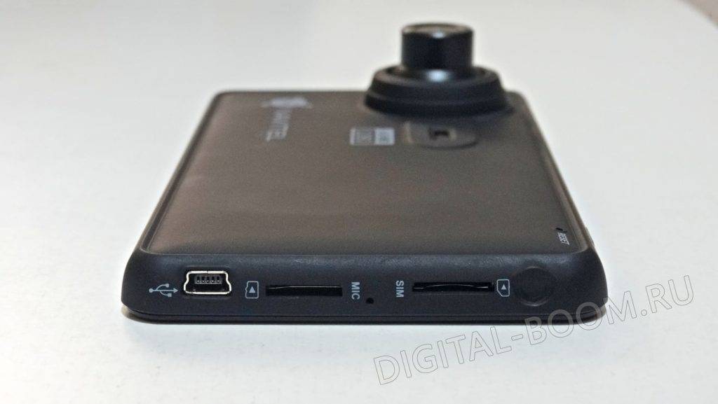 На тыльной стороне в правом верхнем углу расположилась камера видеорегистратора на поворотном сферическом основании. Цилиндр прилично выступает из-за корпуса, поэтому при переноске устройства стоит подумать о защите камеры каким-то колпачком (и не забывать снимать его перед установкой на лобовое стекло). Рядом с камерой имеется небольшое окошко с сеточкой, которое по стереотипу можно принять за светодиодную подсветку. Но, как оказалось, это отверстие для динамика.