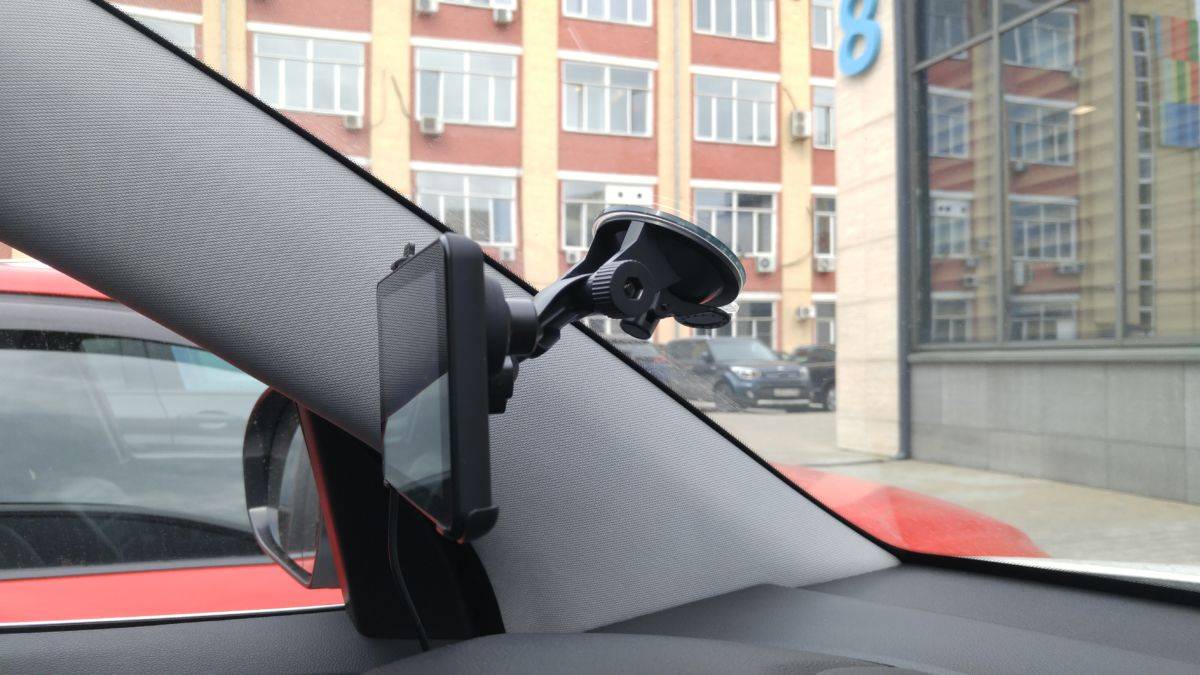 На лобовом стекле Navitel RE900 Full HD через ассиметричный пластиковый переходник фиксируется массивным креплением на присоске. Несмотря на довольно внушительный вид, в движении конструкция не издает посторонних звуков и не вибрирует при проезде неровностей.