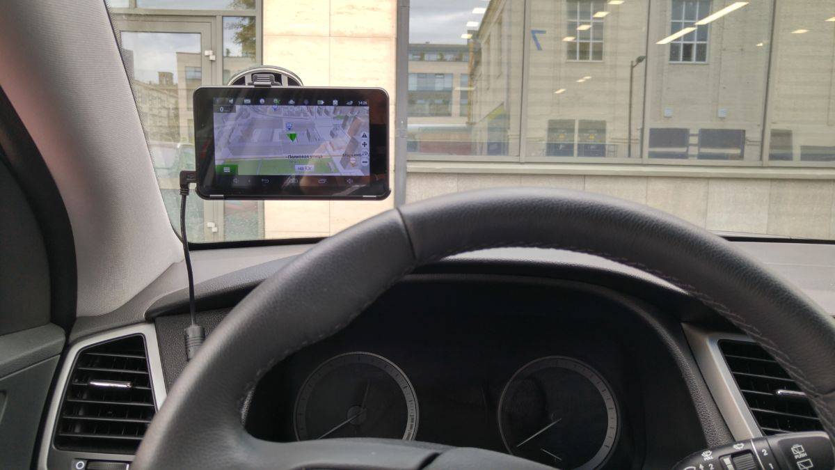 В комплекте с устройством идет адаптер питания в прикуриватель с кабелем небольшой длины (около 1,5 м), кабель для подключения к ПК, держатель на лобовое стекло с присоской и кредл. Как показал опыт закрепления, установка на него планшета выполняется очень легко, устройство держится очень прочно, но защелка показалась нам несколько тугая при снятии.