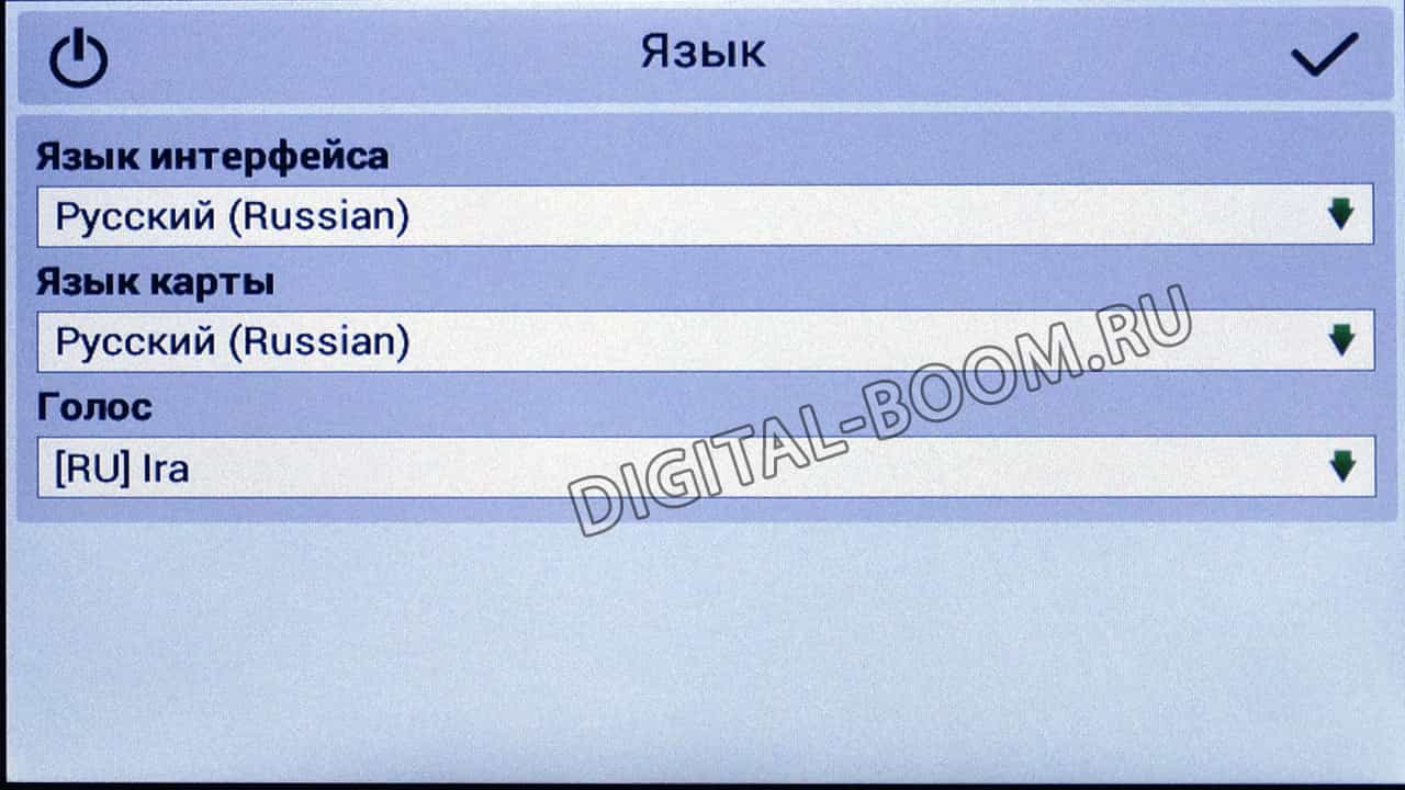 При первом включении навигатор Navitel E707 Magnetic просит выбрать языки: язык интерфейса, язык карты и язык голоса, который будет вести с вами частые «диалоги». Причем на русском языке предусмотрено целых 4 разных голоса. Я выбрал Аленку с нежным голосом.