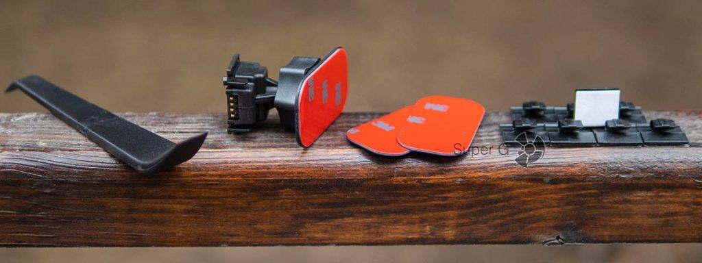 - кронштейн с клейкой лентой для крепления на ветровом стекле (есть запасные ленты)