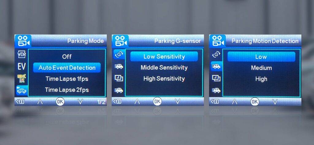 What’s great here is that the dashcams can not only automatically switch between driving mode and parking mode, but they also offer some really useful parking mode features generally only seen on higher end dashcams.