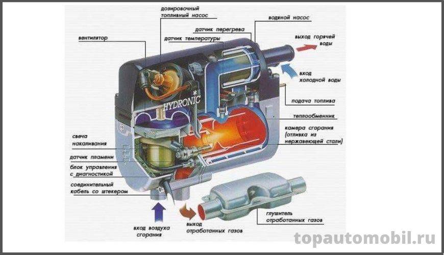 Система электрооборудования подключена к аккумулятору машины. Она нагревает жидкость охлаждения автомобиля, прокачивая антифриз через свой теплообменник. Тепло передается на движок и радиатор от штатной печки — устройство состоит из котла и камеры сгорания, радиатора, комплекса трубок для подачи топлива, насосов для подкачки бензина (солярки) и ОЖ, термореле и блока управления.
