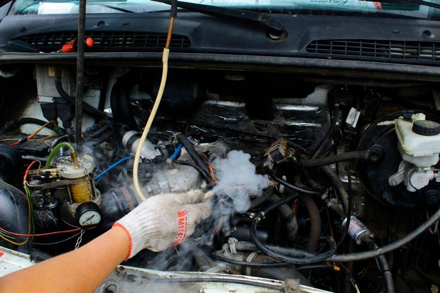 Вернемся к современным машинам, где проверка подсоса воздуха может затянуться по времени и обнаружить утечку бывает не просто. Основной принцип выявления утечек по воздуху в двигателе — подать дым во впускной коллектор, который и будет выходить там, где есть трещина, не плотно затянутая шпилька или порванная резинка. Проверка двс дымогенератором занимает некоторое время и проходит в несколько этапов: