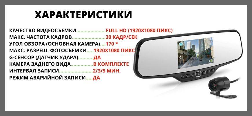 Это недорогой регистратор для транспортного средства. Он представляет собой зеркало заднего вида с дополнительной камерой. Его главное преимущество — цена, которая составляет 5000 ₽.