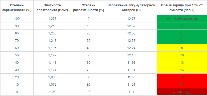 Одним из мероприятий, позволяющих определить, какую емкость заряда имеет автомобильный аккумулятор, является измерение плотности электролитической жидкости. Операция проводится на этапе подготовительных работ перед тем, как зарядное устройство будет подключено. Заряжать аккумуляторные батареи следует с учетом уровня заряда, используя технические средства и устройство, которое будет максимально эффективным для этого типа АКБ. Таблица значений показаний электролита в банках аккумулятора при использовании зарядного устройства ручного управления.