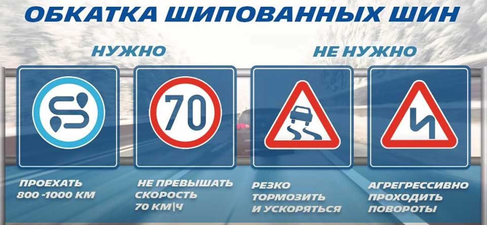 Во избежание негативных последствий важно правильно обкатать новую резину, чтобы шипы заняли необходимую позицию в лунке. Для достижения результата достаточно первые 800-1000 км избегать резкого набора скорости / торможения, ускорений во время поворота и т