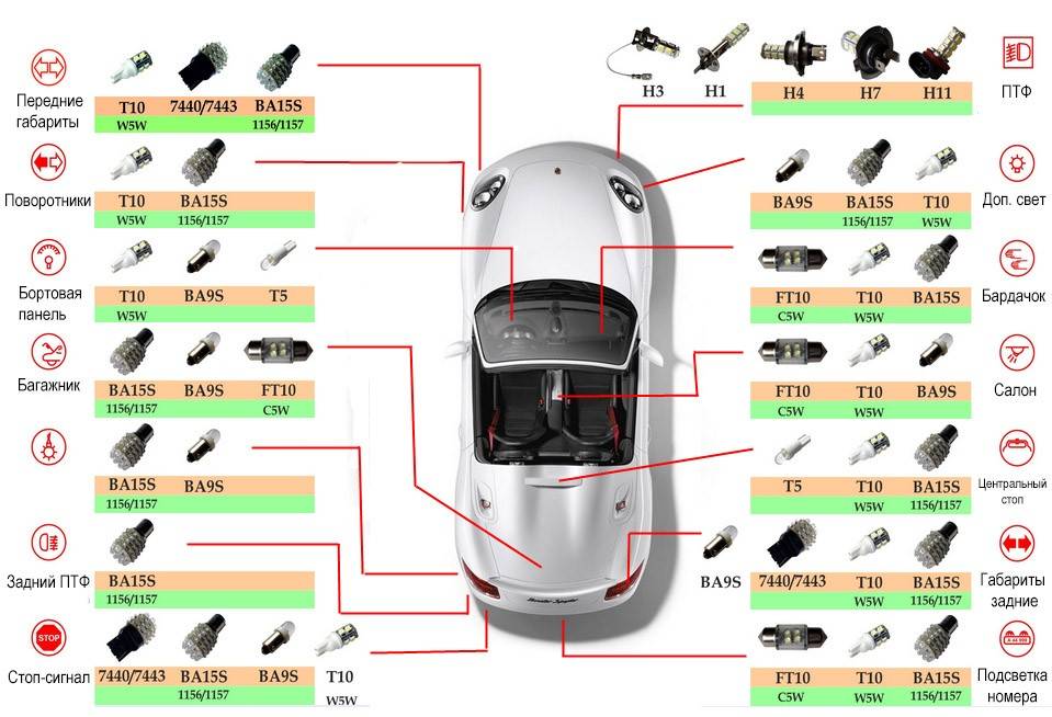 В головной свет, приборную панель, габаритные огни устанавливаются низковольтны модели. Для подсветки торпеды используют капсульный вариант с выводами.