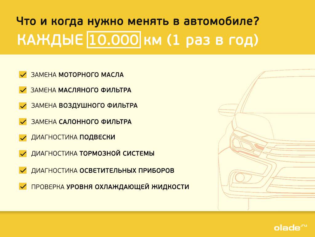 Пробег – это не единственный показатель того, что пора выполнять какие-либо действия. Если за один год вы не «намотали десятку», значит пришло время точно также воспользоваться памяткой. Проще говоря, вы должны обслуживать автомобиль раз в год или каждые 10 000 км. Перечислим все необходимые процедуры технического обслуживания, соответствующие данному пробегу (времени):