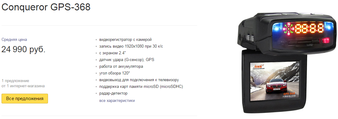 На другом полюсе рынка можно увидеть самый лучший видеорегистратор (это я конечно не серьезно написал, просто многие считают, что самые дорогие вещи – они же непременно самые лучшие). Это модель Conqueror GPS-368:
