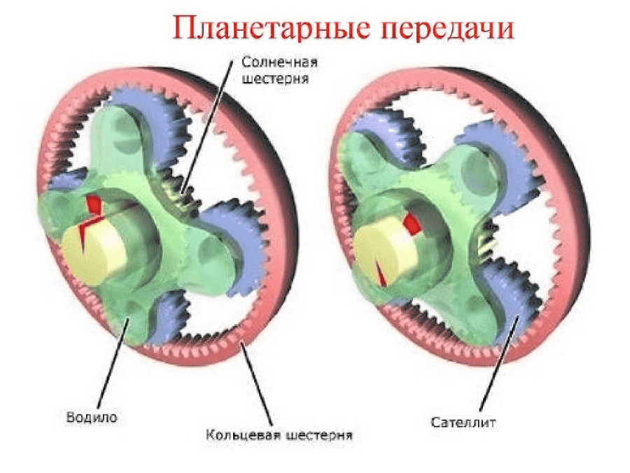 Планетарные. Отличительной особенностью является применение зубчатых колёс, у которых оси подвижные. Обычно предусмотрено наружное колесо с жёсткой фиксацией и с внутренней резьбой. Дополнительно устанавливается центральное колесо, водило и сателлиты. С помощью таких элементов осуществляется перемещение по окружности неподвижного колеса, реализуя тем самым вращение центрального.