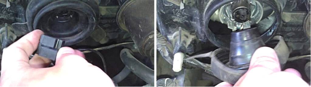 После извлечения старой лампы надо установить новую в обратном порядке с соблюдением мер безопасности. После подключения разъема и установки на место защитной крышки можно опробовать работу системы головного света.