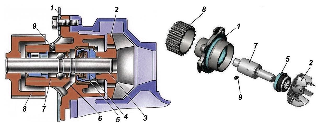 Водяная помпа — механизм для обеспечения циркуляции жидкости в системе охлаждения автомобиля. Это влечет за собой существенные финансовые затраты и трудоемкие дорогостоящие работы, нежели обычная замена водяной помпы. Просачивание через некачественный поврежденный сальник жидкостей тосол, антифриз к подшипникам вызывает вымывание смазки, в результате чего происходит более быстрый износ, ведущий к заклиниванию насоса, а в дальнейшем — к разрыву ремня ГМР и сгибанию клапанов.