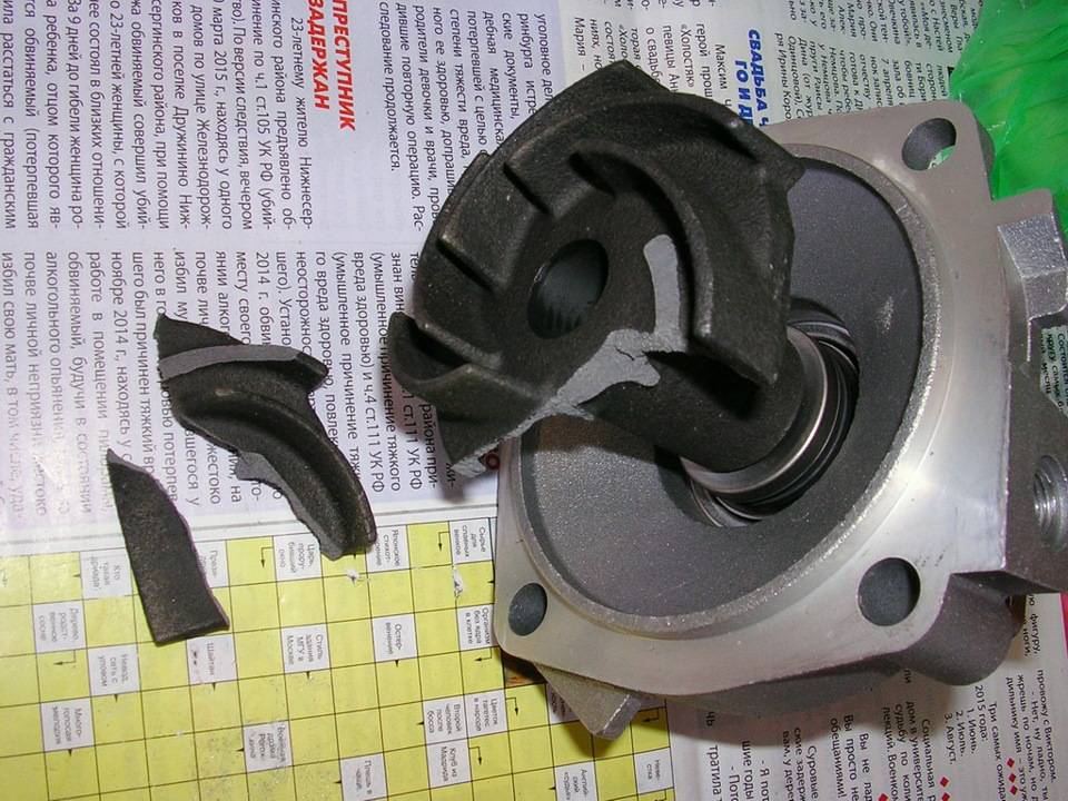 После извлечения водяного насоса производится осмотр лопастей крыльчатки. Они могут обломиться или потрескаться. Это происходит, если двигатель был сильно перегрет, или крыльчатка изготовлена из некачественного материала. Мелкие осколки лопастей обычно вываливаются через сливной кран.