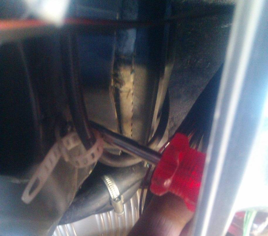 Итак вся жидкость слита, хомуты сдернуты, радиатор вылезает чуть-чуть и упирается в нижнюю часть панели, на фото видно место подтека.