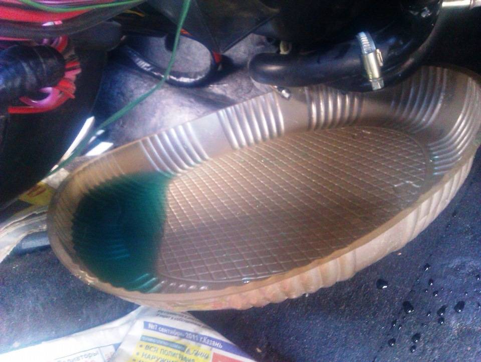 - следы охлаждающей жидкости на резиновых ковриках или ковролине под бардачком.