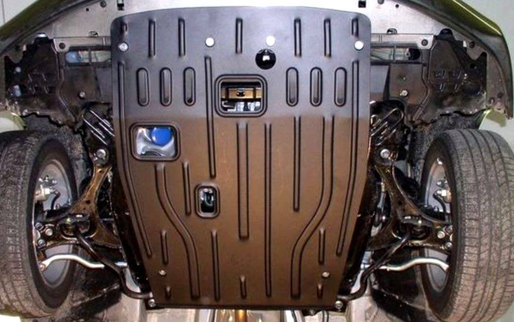 Конструктивно защита не представляет ничего сложного — всего лишь кусок металла с креплениями, при помощи которых он крепится к днищу машины в районе картера двигателя.